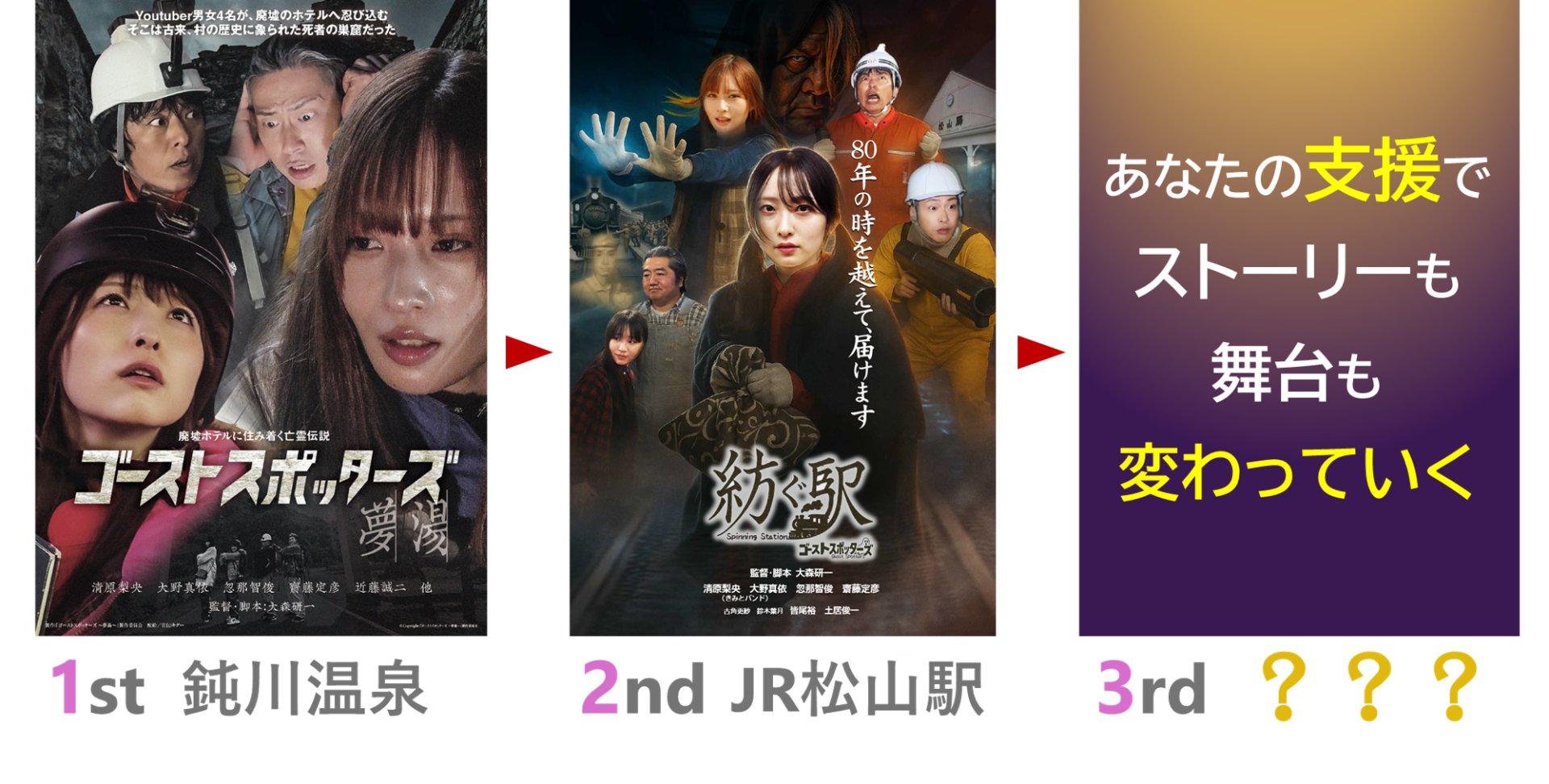 『ゴーストスポッターズ』は、地域振興とSDGsな映画作りの取組みとして、監督をはじめキャスト全員による「ほぼ手弁当」で製作を進めているシリーズです。協賛いただいた資金は、製作費として大切に使用させて頂きます。