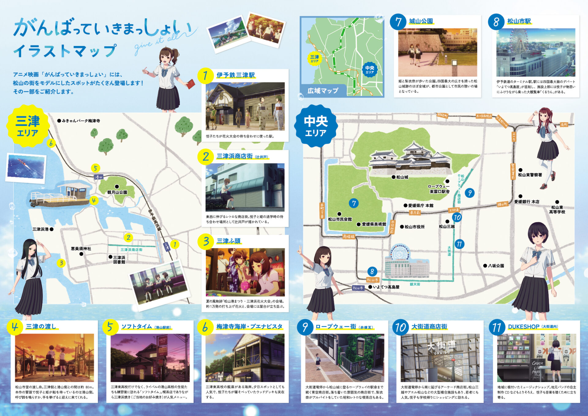 聖地巡礼イラストマップ 松山の街をモデルにしたスポットがたくさん登場します!舞台となった聖地を巡るイラストマップ、聖地巡礼の際にぜひご利用ください。 \ダウンロード・印刷してご利用下さい!/ PDFをダウンロード