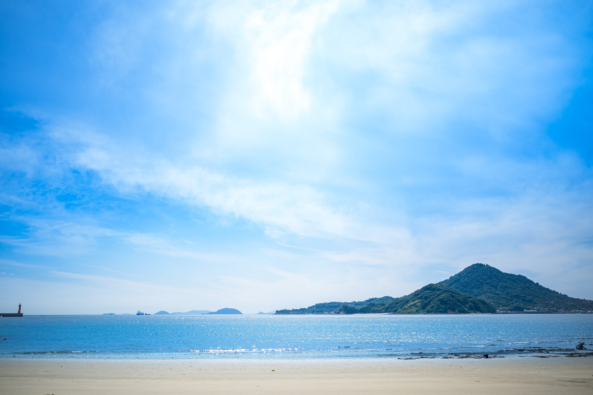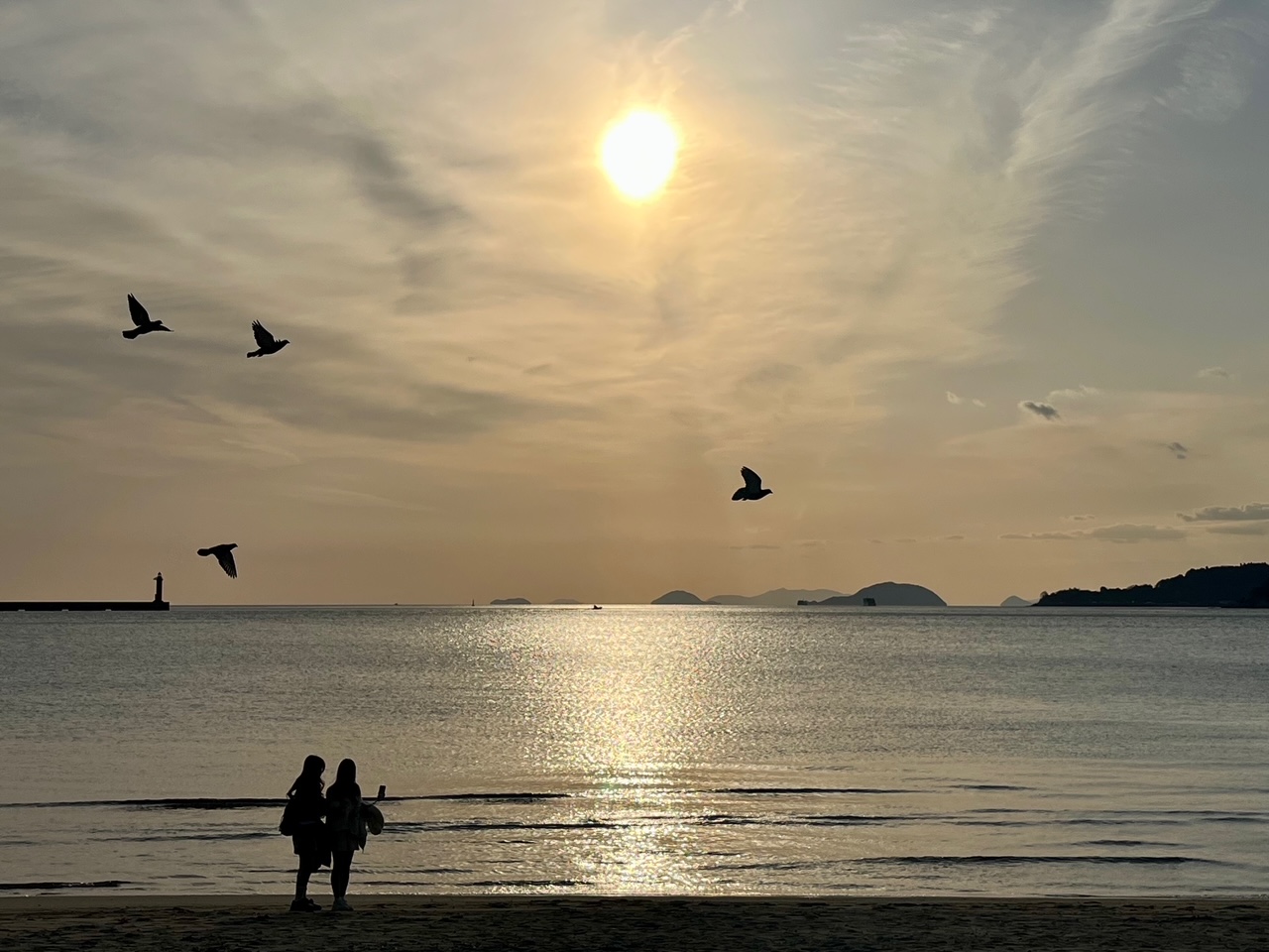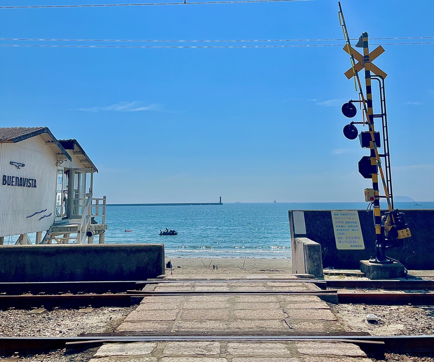 改札を抜ければ海。伊予鉄高浜線梅津寺駅の柵の向こうには美しい海が広がっています。砂浜に降り立って波の音・潮の香りに身をゆだねる。